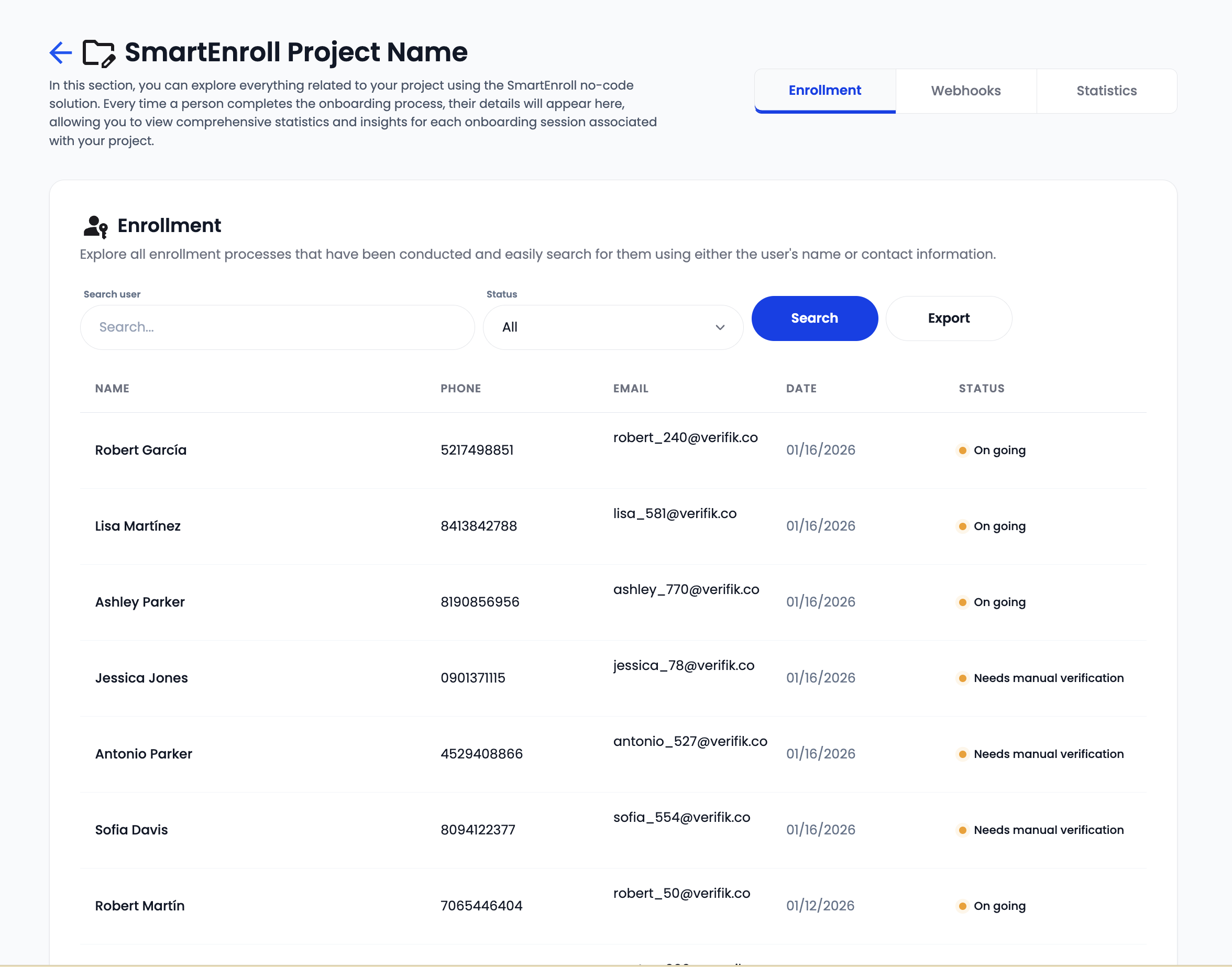 View and manage all registered users in your SmartEnroll projects with comprehensive filtering and search capabilities.