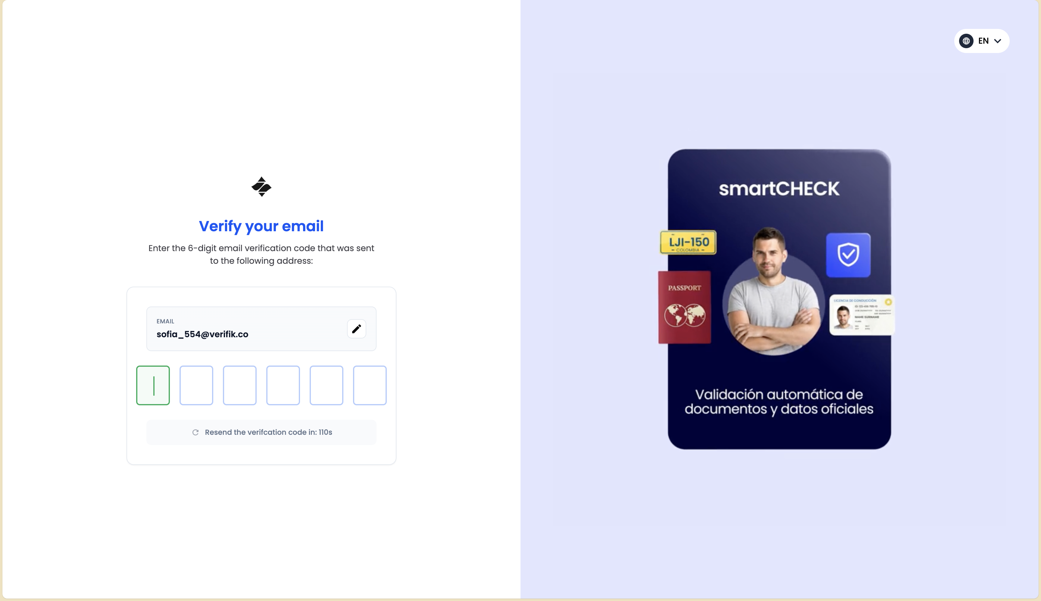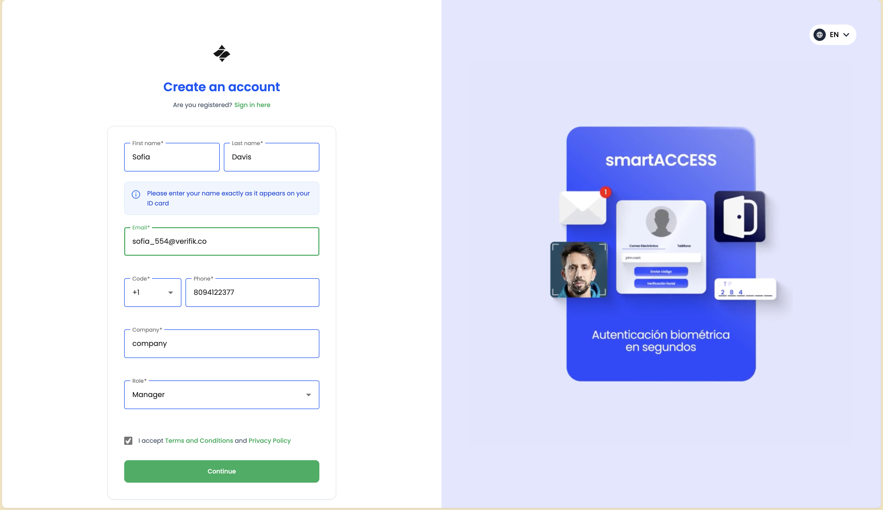 - Email Address: A valid email address that will be used for verification (e.g., "sofia_554@verifik.co")